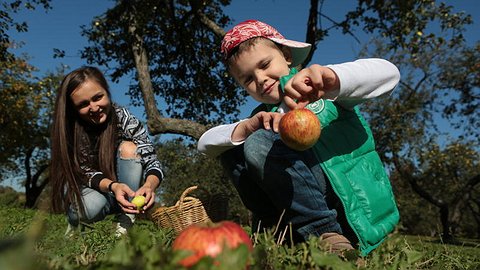 И вправду, солнечный сад буквально усеян красными, желтыми, зелеными яблоками. Они — на деревьях, они — на земле. И людей здесь видимо-невидимо. Кто как может, старается сорвать спелый фрукт. Детишки изо всех сил стараются раскачать деревья, а мамы едва успевают увернуться от яблокопада. Неопытных собирателей урожая, тех, кто здесь в первый раз, видно сразу. Не разгибаясь, ищут в траве красивые фрукты.